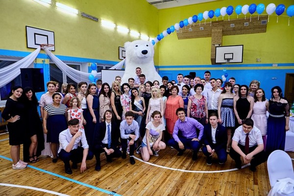 После традиционного вручения аттестатов, ребята расселись за столы и праздник начался. Первым поздравить выпускников вышел самый настоящий белый медведь, вызвав своим появлением кучу восторгов. И дети, и родители бесконечно обрадовались появлению большого друга, охотно с ним потанцевали и пофотографировались.